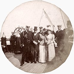 | Left to Right: Tzar Alexander III , Crown Prince George (George V) , Marie Feodrovna , Maria of Greece , Tzarovitch Nicolas (Later Tzar Nicholas II of Russia). Probably taken on the Royal Yacht near Denmark. | NLW Photo Album 279C | Alexandra of Denmark (1844-1925) | Datei:Tzar Alexander III and members of the Royal family.jpg |