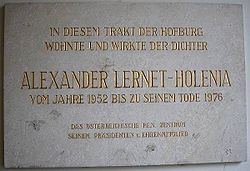 | Gedenktafel für Alexander Lernet-Holenia in der Wr. Hofburg | Eigenes Werk | GuentherZ | Datei:GuentherZ 2005-10-04 2299 Wien01 Hofburg Gedenktafel Alexander Lernet-Holenia.jpg | |