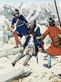 | Regiment "Kurland" 1686. Der verwundete Prinz Alexander von Kurland während des Sturms auf Buda. Im Vordergrund: ein Offizier und Alexander. Links und hinter ihm: rechts die Musketiere des Regiments; ein Unteroffizier des Regiments. | Rudolf Louis Oskar Kopka von Lossow (1889) Geschichte des Grenadier-Regiments König Friedrich I. (4. Ostpreussischen) Nr. 5 , 1, Berlin : E. S. Mittler und Sohn | Richard Knötel | Datei:Kurland Regiment 1686. Alexander.jpg |