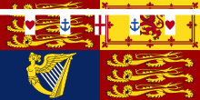 | Coat of Arms of HRH Princess Alexandra, The Honourable Lady Ogilvy . (born 1936) only daughter of Prince George, Duke of Kent (fourth son of King George V) and Princess Marina of Greece and Denmark. The coat of arms was granted in 1961. “ Quarterly, 1st and 4th Gules three lions passant guardant in pale Or armed and langued Azure (for England), 2nd quarter Or a lion rampant within a double tressure flory-counter-flory Gules (for Scotland), 3rd quarter Azure a harp Or stringed Argent (for Ireland), with over all a label of five points Argent, the first and fifth points bear a heart Gules, the second and fourth points bear an anchor Azure, and the third point bears a cross Gules, the lozenge ensigned by a coronet of a grandchild of the Sovereign, the whole surrounded by the Garter, for supporters, dexter a lion rampant guardant Or crowned by the same coronet, sinister a unicorn Argent armed, crined and unguled Proper, gorged with the same coronet, attached thereto a chain affixed thereto passing between the forelegs and reflexed over the back also Or, both charged on the shoulder with a label as in the arms. ” | Eigenes Werk | Sodacan | Datei:Coat of Arms of Alexandra, The Honourable Lady Ogilvy.svg | |