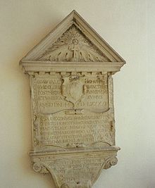 FÜR SEINE VERDIENSTE. WAS BEDEUTET DIESE WELT, WAS DER RUHM ODER DER TRIUMPH ? NACH DEM ELENDEN BEGRÄBNIS SIND WIR STAUB UND SCHATTEN. IM JAHRE DES HERRN 1591, AM TAGE DER BEKEHRUNG DES PAULUS STARB IN CHRISTUS DER EHRENWERTE UND HERVORRAGENDE HERR MEISTER ALEXIUS PAYOS, ITALIENER, STEINMETZ, GEBOREN IN MONTEMAGRE, WELCHER IN DANKBARKEIT FÜR SEINE KUNSTWERKE NACH DEN MÜHEN ERMATTET, ENDLICH SEINEN LETZTEN TAG BESCHLOSSEN HAT. DIE ERBEN SELBST HABEN DAS DENKMAL SETZEN LASSEN.