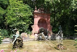 | Herzog-Alfred-Brunnen im Coburger Hofgarten. Die beiden Figuren stammen August Sommer, links „Schreck“ und rechts „Idylle“. | Selbst fotografiert | Störfix | Datei:Coburg-Hofgarten-Alfred-Brunnen.jpg | |