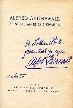 Alfred Grünewald : Sonette an einen Knaben , Verlag Eduard Strache, Wien - Prag - Leipzig, 1920 | http://www.qwien.at/?p=1757 (Sammlung QWIEN) | Alfred Grünewald (1884-1942) | Datei:Alfred Grünewald - Sonette an einen Knaben, 1920.jpg | |