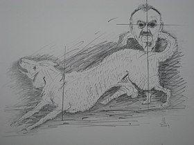 - 1986 Waldheim-Pferd bzw. Denkmal gegen Gedächtnisschwund. Die der Spaßguerilla zugehörige Aktionsform wurde später bei Demonstrationen gegen neofaschistische Tendenzen fortgeführt[44] und als Beispiel für eine „Spielform des anarchischen Fluxus“[45] von publikumswirksamem, „treffsicherem aktuellem Witz“ gedeutet.[46] Wurde schließlich zum Quasi-Maskottchen des Republikanischen Clubs – Neues Österreich, kennzeichnet als kleiner Grafik-Kopf auch dessen Publikationen (Flugblätter, Programmfolder), das zerlegbare Original lagert in seinen Vereinsräumen.