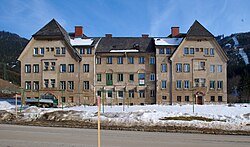 | Arbeiterwohnhaus. Erbaut 1917 nach Plänen von Alfred Keller sen. für die Österreichischen-Alpinen-Montangesellschaft | Eigenes Werk | Granada | Datei:Eisenerz Arbeiterwohnhaus Vordernberger Straße 89, 91 D5C 3522.jpg | |