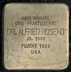 | Stolperstein : Dr. Alfred Roseno (Bismarckstraße 5), Köln. | Eigenes Werk | © 1971markus | Datei:Stolpersteine Köln, Dr. Alfred Roseno (Bismarckstraße 5).jpg |