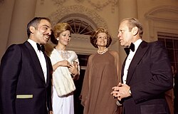 | King Hussein of Jordan and his third wife, Queen Alia , after a state dinner with President Ford and his wife. | http://www.fordlibrarymuseum.gov/images/avproj/pop-ups/A9002-15A.html | Ricardo Thomas | Datei:King Hussein and Queen Alia with the Fords.jpg |