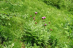 | Habitat der Alpen-Bergscharte (Stemmacantha rhapontica, Asteraceae); Arolla, Kanton Wallis, Schweiz | Eigenes Werk | MurielBendel | Datei:Stemmacantha rhapontica habitat Valais.JPG |
