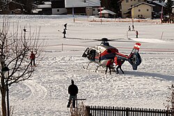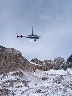| Einige Alpinpolizisten verladen ihre Ausrüstungsgegenstände in den Polizeihelikopter, nachdem klar geworden ist, dass ein vermisster Mann in einer Lawine umgekommen ist. | originally posted to Flickr as Sad day | Adam Kerfoot-Roberts | Datei:Police helicopter Austria.jpg |