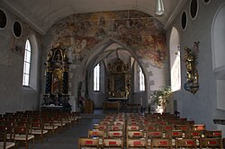 Das Kircheninnere zeigt im Langhaus über den Spitzbogenfenstern über einem Gesimsband eine Flachbogentonne. Der Chorbogen ist eingezogen und abgefast. Der eingezogene einjochige Chor mit einem Fünfachtelschluss hat ein Netzrippengewölbe mit einfach gekehlten Rippen auf Konsolen mit Masken und Wappen, von links nach rechts eine Fratze, ein österreichisches Bindenschild, einen Cherubskopf, eine Blattkonsole mit 1540, eine Fratze und ein bärtiger Kopf. Die runden Schlusssteine zeigen ein Relief hl. Ulrich und den Doppeladler.