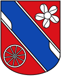 | Wappen von Altenmarkt bei St. Gallen : Im roten Schild ein blauer Schrägrechtsbalken, gesäumt von je einem silbernen Ruder mit einwärts gekehrtem Blatt, wobei das Blatt des oberen Ruders an den hinteren, das Blatt des unteren Ruders an den vorderen Schildrand stößt; oben erscheint eine fünfschaufelige silberne Turbine, unten ein silbernes Wagenrad. | Ursprung unbekannt Unknown source file: Eigenes Werk | Autor/-in unbekannt Unknown author file: Amada44 , | Datei:AUT Altenmarkt bei St. Gallen COA.svg | |