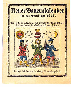 | Titelblatt des Mandlkalenders 1947 (Neuer Bauernkalender 1947) | Eigener Scan | abgebildetes Layout jedenfalls vor 1847 entstanden, Idee bereits 1636 belegt (Sepp Walter, Bauernkalender, Seite 17, ISBN 3-7011-7905-0 ), Urheber unbekannt, aber vor mindestens 100 Jahren verstorben | Datei:Bauernkalender 1947.jpg | |