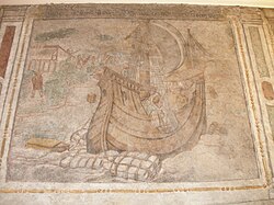 Fresken von Georg Müller – Symbol der iustitia commutativa: ein in Hafennähe in Seenot geratenes Handelsschiff, von dem Ballast abgeworfen wird, um das Kentern zu vermeiden ( Seewurf)