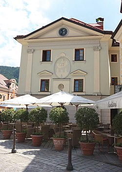 Das repräsentative Eckhaus mit spätklassizistischer Fassade stammt aus der ersten Hälfte des 19. Jahrhunderts mit einem älteren Kern. Die Fassaden werden durch Kordon- und Kranzgesims horizontal gegliedert. Ionische Riesenpilaster flankieren die Fensterachsen im Obergeschoß. Zwischen den Fenstern ist ein römerzeitliches Rundmedaillon eines Grabbaus eingemauert. Im Medaillon aus der Mitte des zweiten Jahrhunderts ist eine Frau in einheimischer Tracht mit norischer Haube zu sehen. Darüber befindet sich ein Stuckrelief in einem verzierten, ovalen Rahmen mit der Darstellung der Justitia und dem Stadtwappen. Die Fenster im ersten Obergeschoß weisen profilierte Rahmungen, Dreiecksgiebelverdachungen und Münzschnittfriese in den Sturzfeldern auf. Die Fenster im zweiten Obergeschoß haben einfache Sohlbankgesimse auf Blattvolutenkonsolen. Am Mittelrisalit ersetzen Fascien und ein Mäanderfries die Fensterverdachung. An der Straßenseite haben die Fenster alternierende Dreiecks- und Segmentgiebelverdachungen und weisen in den Sturzfeldern Münzschnitt bzw. Mäanderfries auf. Das Rundbogenportal besitzt schmiedeeiserne Läden.