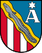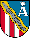 Blasonierung: „Von Blau und Rot schräg geteilt durch einen goldenen Wellenbalken, darin ein schwarz-grauer Aal; oben ein silberner, von einem ebensolchen Stern überhöhter Antiqua-Versalbuchstabe A; unten zwei silberne Pfähle.“ |