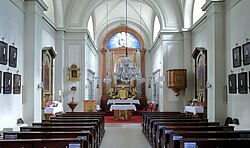 | Innenansicht der Pfarrkirche hl. Oswald am Khleslplatz in Altmannsdorf , ein Bezirksteil des 12. Wiener Gemeindebezirkes Meidling . Die einschiffige Kirche mit geradem Chorabschluss wurde in den Jahren 1838/39 nach den Plänen des Architekten Franz Lößl errichtet. | Eigenes Werk | C.Stadler/Bwag | Datei:Altmannsdorf (Wien) - Kirche, Innenansicht.JPG | |