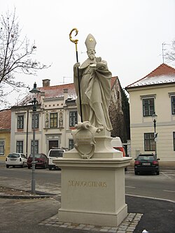 | Statue des hl. Augustinus vor der Altmannsdorfer Kirche zum hl. Oswald in Wien-Meidling Dieses Bild zeigt das in Österreich unter der Nummer 25595 denkmalgeschützte Objekt. ( Commons , de , Wikidata ) | Eigenes Werk | Buchhändler | Datei:Altmannsdorfer Kirche7.JPG | |