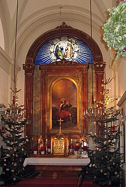 | Hochaltar mit Darstellung des hl. Oswald (1834) von Johann Matthias Ranftl in der Altmannsdorfer Kirche in Wien-Meidling | Eigenes Werk | Buchhändler | Datei:Altmannsdorfer Kirche Altar-1.jpg | |