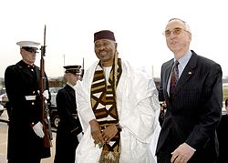 | Deputy Secretary of Defense Gordon England (right) escorts Malian President Amadou Toumani Toure through an honor cordon and into the Pentagon on February 12, 2008. | DefenseImagery.mil, VIRIN 080212-D-9880W-088 | Robert D. Ward | Datei:AmadouToumaniToure2008.jpg | |