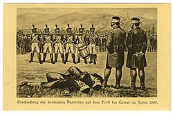 | Erschießung des Andreas Emmerich bei Kassel durch französische Truppen 1809 | Illustration aus einem alten Buch, das nicht vollständig vorliegt - nur diese Seite | Namenszeichen auf der Zeichnung unleserlich | Datei:Erschießung Emmerichs.jpeg |