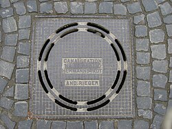 | alter von der Firma Andreas Rieger (später Independenţa) vor 1918 produzierter Kanaldeckel in Hermannstadt/Sibiu/Nagyszeben | Eigenes Werk | El bes | Datei:Andreas Rieger Kanaldeckel Sibiu.jpg |