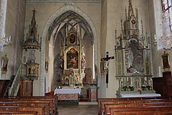 Das Gotteshaus ist ein spätgotischer Bau. Die ursprünglich spitzbogigen Fester wurden im Barock durch rechteckige Fenster ersetzt. Der südlich an den Chor angebaute Turm mit drei Schallgeschoßen wird von einer Biedermeierhaube bekrönt. Eine Glocke goss 1738 Josef Grassmayr. Die Kirchenportale aus Serpentin weisen Rundstabprofilierungen auf. Das einschiffige Langhaus ist flach gedeckt. Das Deckengemälde zu Ehren des Bischofs Kahn entstand 1915. Die Westempore ist zweigeschoßig. Die Orgel mit barockisierendem Gehäuse wurde 1988 von der Firma Rieger in die Brüstung der Empore eingebaut. Ein spitzbogiger Triumphbogen verbindet das Langhaus und den zweijochigen Chor mit Dreiachtelschluss. Im Chor aus dem 15. Jahrhundert erhebt sich ein Netzrippengewölbe auf Konsolen. Die Fresken im Chor wurden 1983 freigelegt. Dargestellt sind auf der linken Seite der Tod und die Krönung Mariens, auf der rechten Seite Heilige. Das Chorgewölbe ist mit Ranken bemalt. Von der Chorsüdwand führt eine profilierte Spitzbogenöffnung in den Turm. Der Zugang zur Sakristei befindet sich in der Chornordwand.