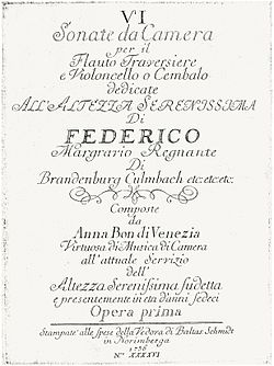 | Anna Bon di Venezia, VI Flöten-Sonaten op. I, 1756, gewidmet Markgraf Friedrich von Bayreuth | Diese Datei wurde von diesem Werk abgeleitet: Anna Bon di Venezia, op. I, title page. Untitled1.jpg : | Anna_Bon_di_Venezia,_op._I,_title_page._Untitled1.jpg : Motmel derivative work: Hic et nunc | Datei:Anna Bon di Venezia-op I-title page.jpg | |