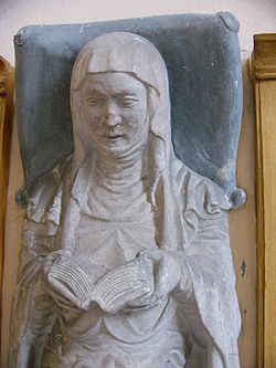 An sie erinnert eines der wenigen aus der Klosterzeit erhaltenen Steindenkmäler. Sie ist in leicht geschwungener Haltung als Nonne abgebildet. Sie steht auf einem Löwen, in den Händen das Brevier haltend, unten zwei Wappen. Das Grabmal weist in der Art seiner Ausführung auf den Wolfskeelmeister hin.[1]