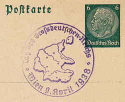 Am 15. März verkündete Hitler auf dem Heldenplatz in Wien unter dem Jubel von ca. 250.000 Menschen „den Eintritt meiner Heimat in das Deutsche Reich“. (Die exakte Zahl der Zuhörer ist nicht ermittelt. Überwiegend werden 250.000 angenommen.[44]) Er bezeichnete Österreich als „älteste Ostmark des Deutschen Volkes“ und „jüngstes Bollwerk der Deutschen Nation und damit des Deutschen Reiches“, vermied aber, den Namen Österreich zu nennen. In zahlreichen Wiener Betrieben war die Belegschaft dazu verpflichtet worden, an dieser Kundgebung geschlossen teilzunehmen. Der Jubel auf dem Heldenplatz spiegelte die begeisterte Stimmung in einem großen Teil der Bevölkerung wider.