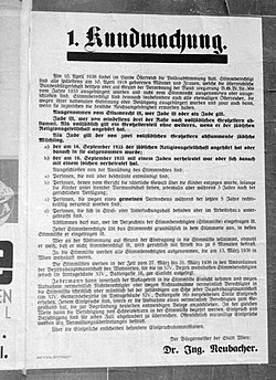 - ↑ Der Text des Stimmzettels war durch die Verordnung der Bundesregierung vom 15. März 1938 wie folgt festgelegt worden: „Bekennst Du Dich zu unserem Führer Adolf Hitler und damit zu der am 13. März 1938 vollzogenen Wiedervereinigung Österreichs mit dem Deutschen Reich?“ (Stimmzettel in der Anlage im Gesetzblatt für das Land Österreich zu Nr. 2/1938).