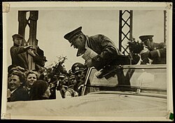 Nachdem Hitler am 11. März 1938 die militärische Weisung für den Einmarsch in Österreich unter dem Decknamen „Unternehmen Otto“ erteilt hatte, rückten am 12. März 1938 Soldaten der Wehrmacht, Einheiten der SS-Verfügungstruppe und Polizisten – insgesamt rund 65.000 Mann mit teils schwerer Bewaffnung – unter dem Jubel großer Teile der österreichischen Bevölkerung ein.[36] In einer deutschen Proklamation wurde verkündet, Hitler habe sich entschlossen, sein Heimatland zu befreien und den notleidenden Brüdern zu Hilfe zu kommen. Somit stand er als Vollender der großdeutschen Sehnsucht da, die viele Österreicher in der Zwischenkriegszeit empfanden.[37] Gegenwehr gab es nirgends, obwohl die chaotischen Verhältnisse, die die hastig improvisierte Vorbereitung des Einmarsches vielerorts verursacht hatte, dazu Gelegenheit geboten hätten.[38] Bundeskanzler Schuschnigg hatte das Bundesheer aber angewiesen, kein „deutsches Blut“ zu vergießen.[39]