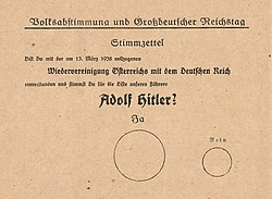 Hitler ließ die Vereinigung Österreichs mit dem Deutschen Reich durch eine Volksabstimmung am 10. April 1938 nachträglich billigen und verband die Entscheidung über den „Anschluss“ auch mit einem Zustimmungsvotum zu sich selbst. Für die Organisation war Josef Bürckel verantwortlich, der 1935 schon die für die Nationalsozialisten sehr erfolgreiche Volksabstimmung im Saargebiet organisiert hatte.[47]