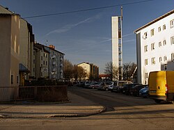 Blick auf den Stadtteil Ansfelden, hinten Richtfunkturm aus 1978 (September 2019) |