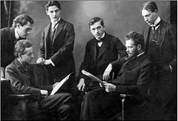 | Aladár Székely: Waldbauer Quartett: Jenő Kerpely, Imre Waldbauer, Antal Molnár, János Temesváry und Béla Bartok (links sitzend) und Zoltán Kodály (rechts sitzend). Zeitpunkt 1910 | http://maimanohaz.blog.hu/2013/01/14/szekely_aladar_1870 | Aladár Székely | Datei:Aladár Székely Bartók Kodály.jpg |