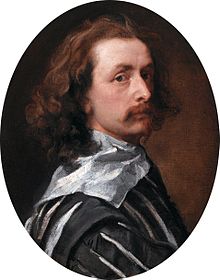 Neben diesen religiösen Arbeiten machte Van Dyck vor allem ganz große Karriere als Porträtmaler: 1628 wurde er von der Statthalterin Isabella Clara nach Brüssel berufen und zu ihrem Hofmaler ernannt, was zu zahlreichen offiziellen Porträt-Aufträgen führte.[42] Er arbeitete außerdem für den Hof von Friedrich Heinrich von Oranien, den Statthalter der nördlichen Niederlande, in Den Haag, den er, ebenso wie dessen Gemahlin Amalia van Solms und ihren gemeinsamen Sohn und Thronerben Willem II., in mehreren Bildnissen verewigte.[43] Für den Prinzen von Oranien schuf er auch zwei historische Gemälde: Rinaldo und Armida im Louvre[44] nach Torquato Tassos Epos La Gerusalemme Liberata, und Die Liebe von Amarilli und Mirtillo, nach einem Schäferroman von Gian Battista Guarini; das Original des letzteren befindet sich wahrscheinlich in Schloss Pommersfelden, zwei Kopien der Werkstatt in anderen Sammlungen.[45]