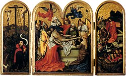 | Triptych with the Entombment of Christ Oil on panel, 60 x 48.9 cm (central panel without frame), 60 x 22.5 cm (wing without frame) London, Courauld Institute Galleries | Aiwaz.net | Robert Campin | Datei:Triptych-with-the-entombment-of-christ-1822.jpg |