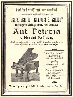 | Advertisement of Czech piano manufacturer Antonín Petrof in Calendar of Zlatá Praha on year 1895 | Kalendář Zlaté Prahy na rok 1895, online http://kramerius.nkp.cz/kramerius/handle/ABA001/19142265 | neuveden/unlisted | Datei:Inzerát Petrof 1895.jpg | |