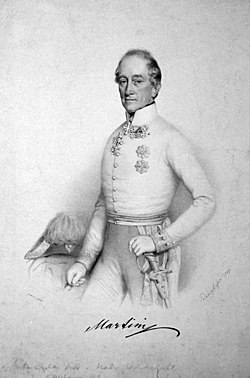 | Anton Stephan Freiherr von Martini (1792-1861), Diplomat, k. k. Feldzeugmeister, Vice-Admiral, Direktor der Wiener Neustädter Militärakademie, Generalstabsoffizier. Lithographie von August Prinzhofer, 1847 | Eigenes Foto einer Originallithographie in Privatbesitz | August Prinzhofer (1817-1885) | Datei:Anton Stephan von Martini Litho.jpg |