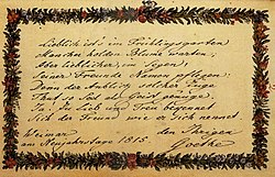 | Eintrag in das Stammbuch Antonie Brentano . | Frankfurt, Freies Deutsches Hochstift | Johann Wolfgang von Goethe | Datei:Antonie Brentano Stammbuch.jpg | |