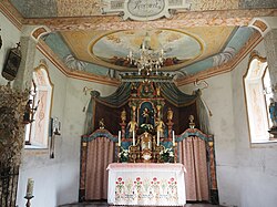 Im flachgedeckten Langhaus steht eine vorschwingende Holzempore von 1893. An die Langhausdecke ist der Kirchenheilige Antonius gemalt. Das Deckengemälde des Chores stellt die Himmelfahrt Mariens dar. Die Fenster sind von gemaltem Ranken- und Blütenwerk umrahmt. An der Altarwand sind ein illusionistischer Baldachin und der heilige Antonius wiedergegeben.