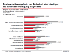| Diese Statistik ist der Öffentlichkeit als Gemeineigentum zugänglich gemacht worden. (siehe Lizenz...) So, wie man keine spezielle Extra-Lizenz benötigt, um eine vom Staat gebaute Straße zu betreten, braucht man auch keine Lizenzen, um veröffentlichte staatliche Statistiken zu verbreiten. Ich hoffe, das ist klar. Bürokratieverrückte toben sich bitte woanders aus, aber bitte nicht an sinnvoller Arbeit, danke. | http://statistik.arbeitsagentur.de/cae/servlet/contentblob/244170/publicationFile/119019/Arbeitsmarkt-Deutschland-Zeitarbeit-Aktuelle-Entwicklung-1HJ2010.pdf | Bundesagentur für Arbeit | Datei:Entgelte Leiharbeit 2010.png | |