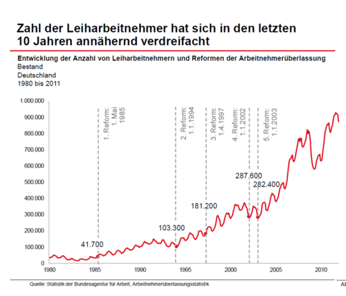 - ↑ Grafik: Entwicklung der Zeitarbeit, aus: Zahlen und Fakten: Die soziale Situation in Deutschland, Online-Angebot der Bundeszentrale für politische Bildung/bpb (2008)