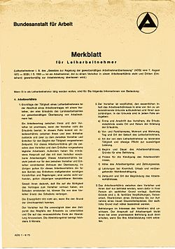 | Facsimile des "Merkblatt für Leiharbeitnehmer" der de:Bundesanstalt für Arbeit , wie es gemäß dem Gesetz zur Regelung der gewerbsmäßigen Arbeitnehmerüberlassung (AÜG) in der ursprünglichen Fassung vom 7. August 1972 jedem Leiharbeiter beim Abschluß eines Arbeitsvertrages mit einem Verleiher ausgehändigt werden mußte. Hier die Vorderseite. Die Rückseite ist in der Datei mit der Nummer 002 am Ende | Official copy kept in the private collection of User:L.Willms | de:Bundesanstalt für Arbeit of the de:Federal Republic of Germany | Datei:Leiharbeiter-Merkblatt AUeG1972 001.jpg | |