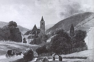| Sievering im Biedermeier, im Vordergrund der Arbesbach , im Hintergrund die Sieveringer Pfarrkirche | Scan of Gantner, Christian: Vom Bach zum Bachkanal. Wien 2004 | Lithographie from Sandmann | Datei:Sieveringer Pfarrkirche Biedermeier.jpg |