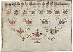 | Ahnenprobe der Gräfin Josepha Maximiliana Lodron (Tochter des Grafen Ernst Maria Lodron) zu 16 Ahnen, Abschrift, signiert L. Forster 1786, Deckfarben auf Pergament, 64 x 87 cm. Wappen Lodron, Waldstein, Sonnau, Ehr, Montfort , Sulz, Thun, Hardegg, Brandis und Hohenfeld. | Dorotheum | Autor/-in unbekannt Unknown author | Datei:Ahnenprobe Lodron Josepha Maximiliana 1786.jpg | |