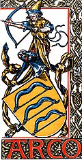 Von Nikolaus von Arco (1306–1356) ist das erste Siegel der Herren von Arco erhalten. Es zeigt einen aufrechtstehenden Bogen in Gold als Wappenzeichen.[92] Die Helmzier ist ein bärtiger Bogenschütze mit einem Straußenfeder-Kopfputz.