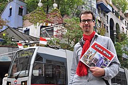 | Arno Steinwender vor ULF der Wiener Linien mit Gesellschaftsspiel | Arno Steinwender | Arno Steinwender | Datei:Ganz Wien-Arno Steinwender.jpg |