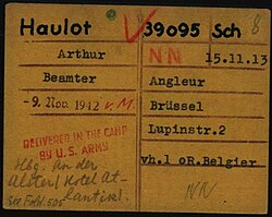 | Registration card of Arthur Haulot as a prisoner at Dachau Nazi Concentration Camp. Red stamp means he was liberated from Dachau by the U. S. Army. Red “NN” identifies a prisoner under “Nacht und Nebel” directive. Red “v.M.” identifies date of arrival at Dachau, transferred from Mauthausen. Arolsen Archives' DocID: 10658915 | Arolsen Archives - International Center on Nazi Persecution www.arolsen-archives.org | Arolsen Archives | Datei:Arthur Haulot Dachau Arolsen Archives.jpg |