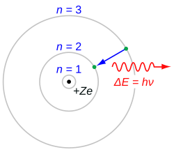 1913 konnte Niels Bohr, aufbauend auf Rutherfords Atommodell aus Kern und Hülle, erstmals erklären, wie es in den optischen Spektren reiner Elemente zu den Spektrallinien kommt, die für das jeweilige Element absolut charakteristisch sind (Spektralanalyse nach Robert Wilhelm Bunsen und Gustav Robert Kirchhoff 1859). Bohr nahm an, dass die Elektronen sich nur auf bestimmten quantisierten Kreisbahnen aufhalten können, die mit steigendem Radius durch die Hauptquantenzahl durchnummeriert werden. Die Elektronen können auch von einer zur anderen dieser Bahnen „springen“, sich jedoch nicht dazwischen aufhalten.[8] Beim Quantensprung von einer äußeren zu einer weiter innen liegenden Bahn muss das Elektron eine bestimmte Menge an Energie abgeben, die als Lichtquant bestimmter Wellenlänge erscheint. Im Franck-Hertz-Versuch konnte 1914 an Quecksilberatomen die quantisierte Energieaufnahme und -abgabe experimentell bestätigt werden. Doch ergab das Bohrsche Atommodell nur für Systeme mit lediglich einem Elektron (Wasserstoff und ionisiertes Helium) quantitativ richtige Resultate. Obwohl es bei Atomhüllen mit mehreren Elektronen grundsätzlich versagte, bildete es das Fundament für eine Reihe von Verfeinerungen, die im Laufe des folgenden Jahrzehnts zu einem qualitativen Verständnis des Aufbaus der Elektronenhüllen aller Elemente führten. Damit wurde das Bohrsche Atommodell zur Grundlage des populären Bildes vom Atom als einem kleinen Planetensystem.[9]