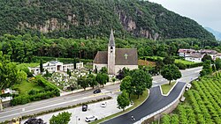 Die St.-Peters-Kirche ist am südlichen Ortseingang an der alten Staatsstraße in Richtung Neumarkt gelegen. Da er erstmals 1183 urkundlich erwähnt wird, dürfte der Sakralbau das älteste Bauwerk der Gemeinde darstellen; ihr romanischer Vorgängerbau wurde radararchäologisch nachgewiesen.[13] In seiner jetzigen Form handelt sich um einen gotischen Bau aus dem 16. Jahrhundert mit romanischem Kirchturm des 12. Jahrhunderts. St. Peter war ursprünglich dem Kloster San Lorenzo in Trient inkorporiert.[4] Aufgrund häufiger Überschwemmungen und den daraus resultierenden Gesteins- und Erdablagerungen liegt die Pfarrkirche etwa fünf Meter tiefer als das umliegende Gelände. Der Kircheneingang ist deshalb über eine nach unten führende Treppe erreichbar.